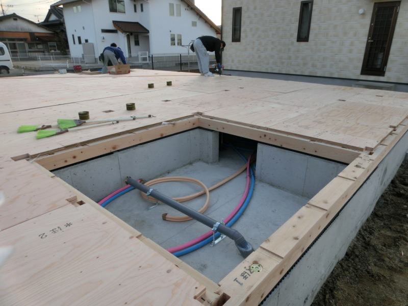 気密や通風のためのパッキン、土台の木、床の断熱材、床の下地材を