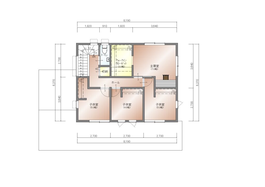 5人家族様の「自転車が置ける広い玄関」「外で洗濯しないので、広い洗濯室が欲しい」「洗面台はおしゃれにしたい」「広いテーブル、ソファを置いてもゆったりのLDKにしたい」「子供部屋は1人に1個作ってあげたい」「リモートワーク用の書斎スペースが寝室に欲しい」を形にしました。