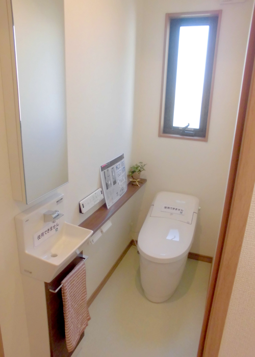 トイレには大きい鏡付収納を配置し、広い空間を演出。