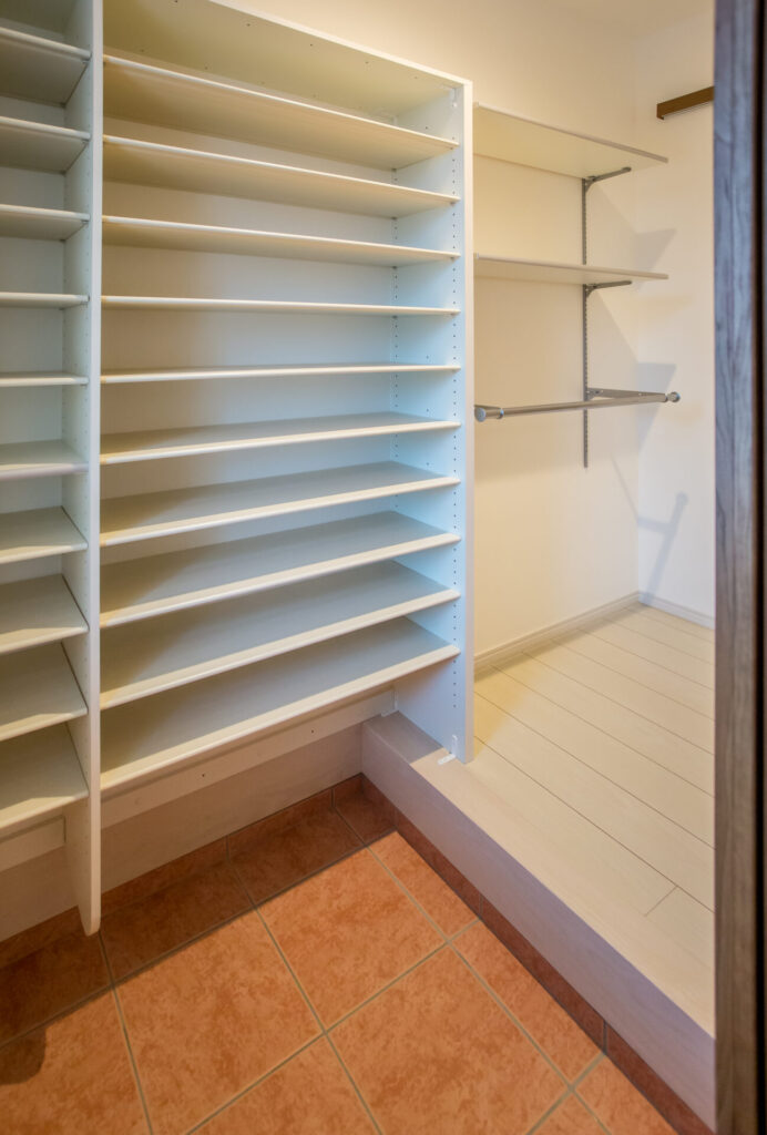 ウォークインクローゼット1階の階段下を有効活用した、家族全員の収納を引き受ける大型の収納スペース。