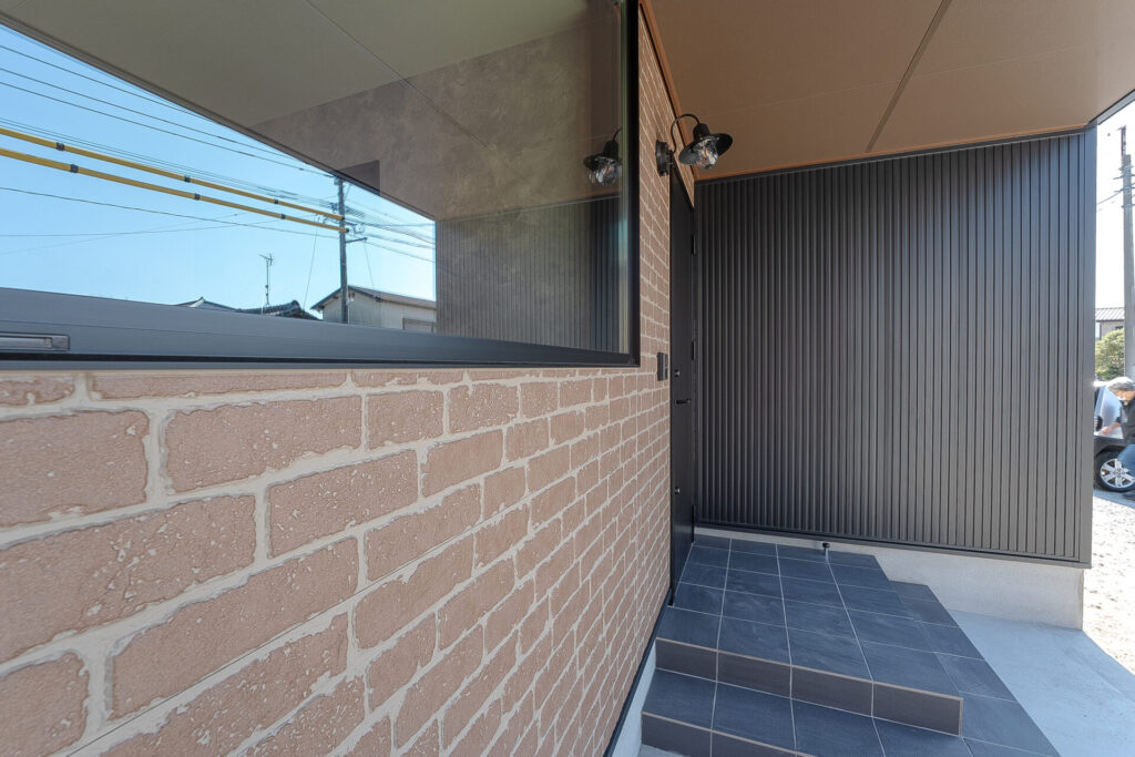 玄関ポーチから玄関内までレンガ柄の流れを作っています。