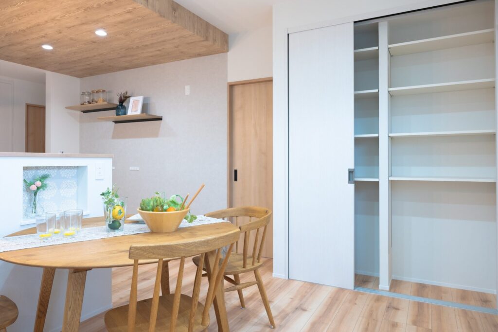 収納キッチン横には買い置き品がたくさん入る収納を設け、ダイニング側にはリビングやダイニングでよく使う物が収納しやすい位置に設けました。