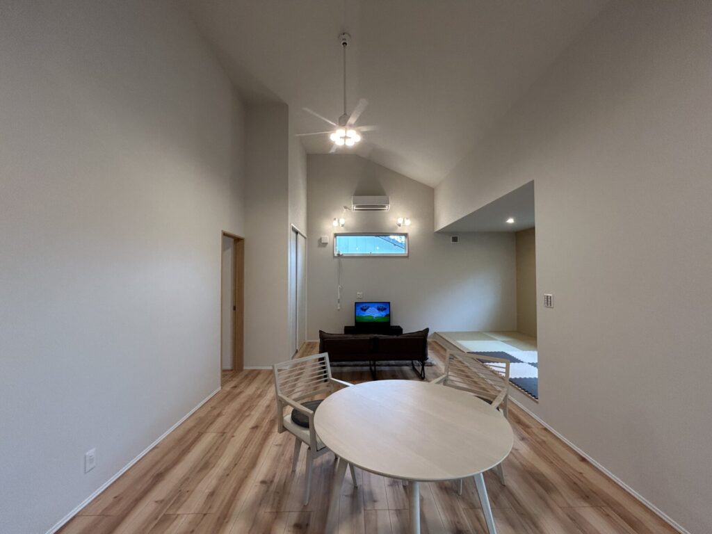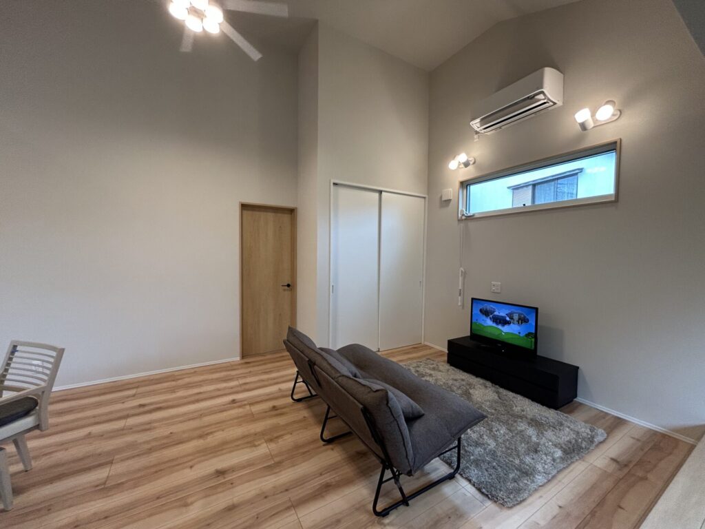 リビングリビングの天井を屋根面に合わせた開放感のある勾配天井にし、広々とした空間でご家族様が集まり、快適に過ごせるようにしました。