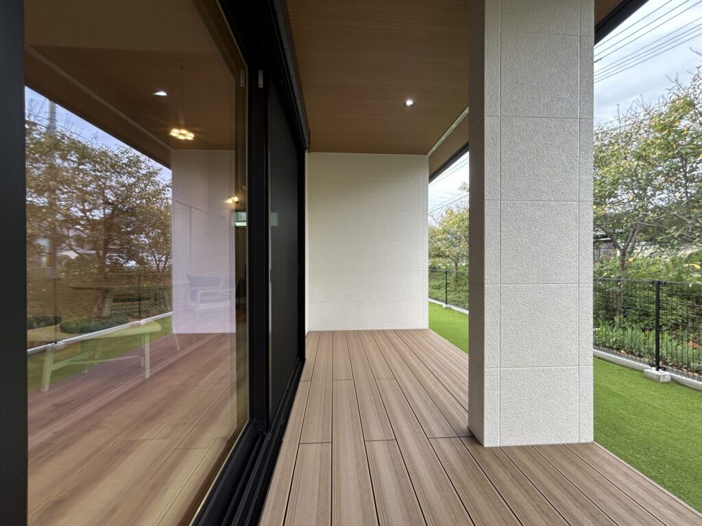 ウッドデッキLDKにある大きな窓からつながるウッドデッキは屋根や照明、コンセントがあり、くつろいだり、バーベキューを楽しまれる予定です。