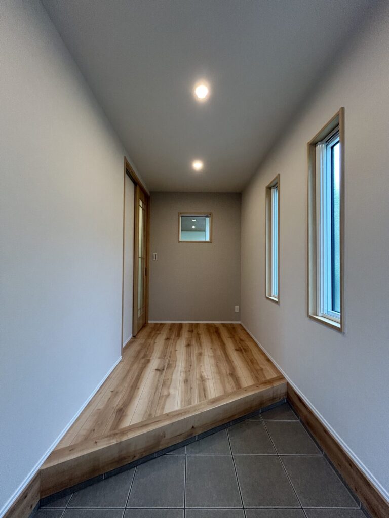 ホールへ上がる段差を斜めにすることで奥行きがあり広々とした玄関になりました。窓を複数設け、明かりや風、庭の眺めを意識しました。