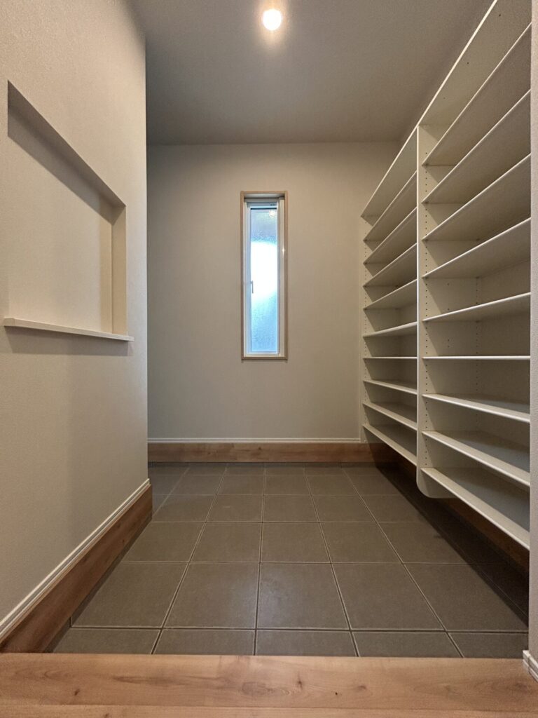 シューズクローク靴の高さで棚の高さが変えられる、大容量のシューズ棚を設けました。壁には写真などの飾り物が楽しめるようにニッチ棚を作りました。