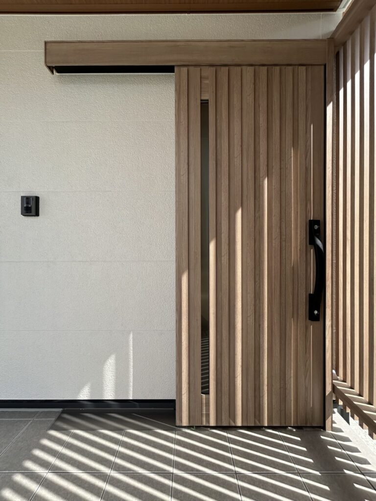 玄関扉玄関扉は出入りのしやすい引き戸を採用。目隠し格子の縦ラインにあわせたデザイン・カラーで統一しています。