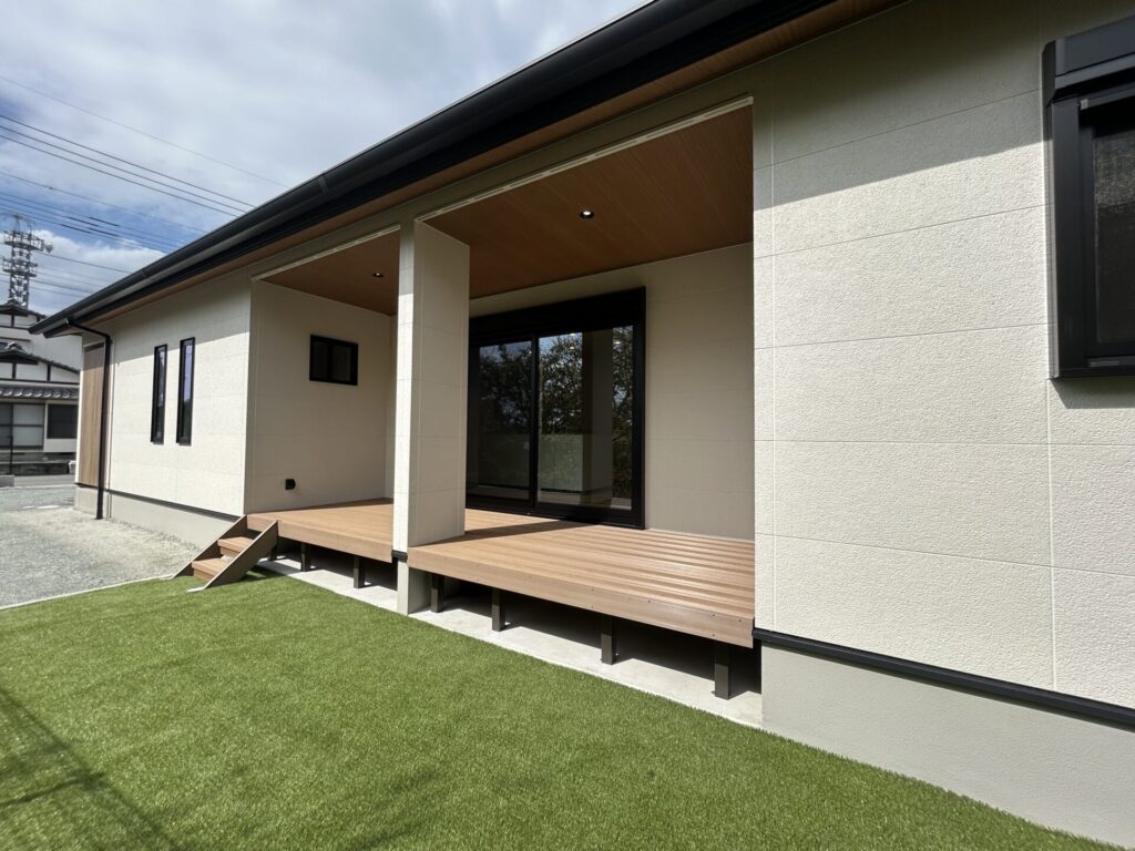 外観白色を基調とした外壁に、木目の天井や格子、ウッドデッキでアクセントを取った明るい外観に仕上がりました。