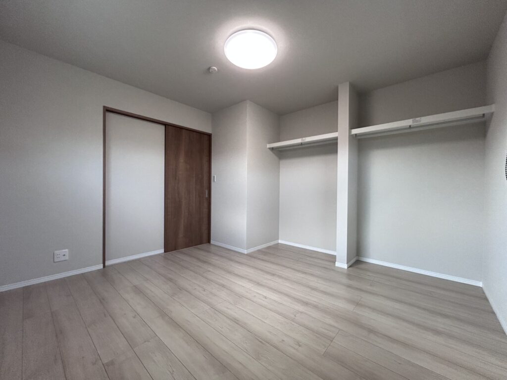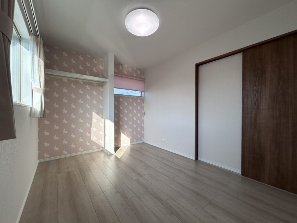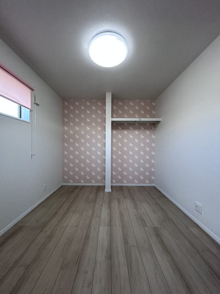 2階寝室小さなお子様と一緒に寝られるように寝室は広く設計しました。こちらのお部屋も収納はオープンとしました。