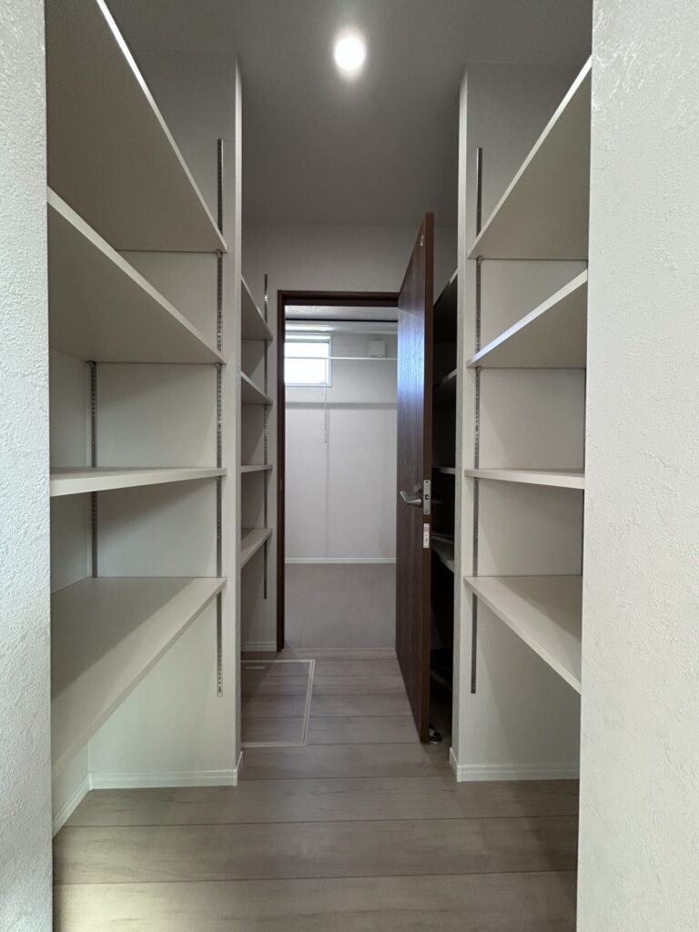 パントリーキッチンからとランドリールームから利用できるウィオークスルー型のパントリーです。買い置き品やよく使う服やタオルなどを収納予定です。