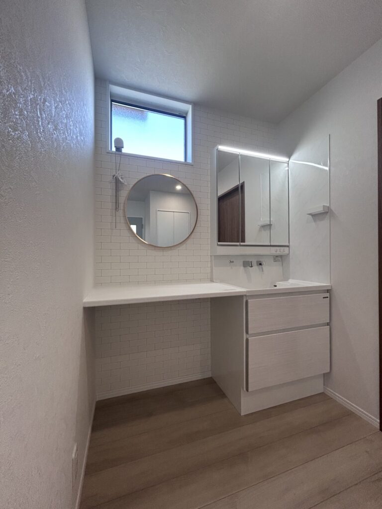 廊下に独立で設置し、ただいま手洗いや、トイレ後の手洗いがしやすい配置にしました。 -
