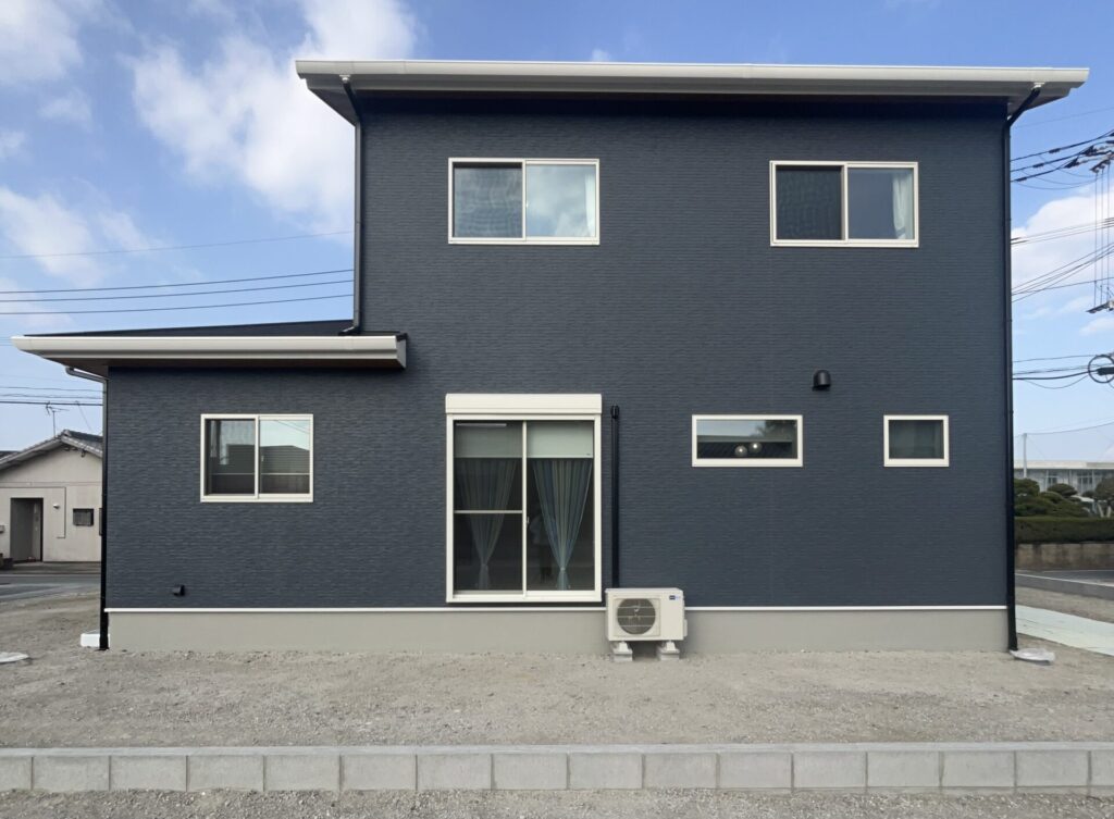 外観外壁はKMEW「カルナック」アトランティックブルー色をメインで使用し、「ニュースリムストーン」ハイドグレー色をアクセントで使用しました。軒天を木目にし、玄関ドアとの調和を取り、ブルーに映えるホワイトのサッシを選ばれました。