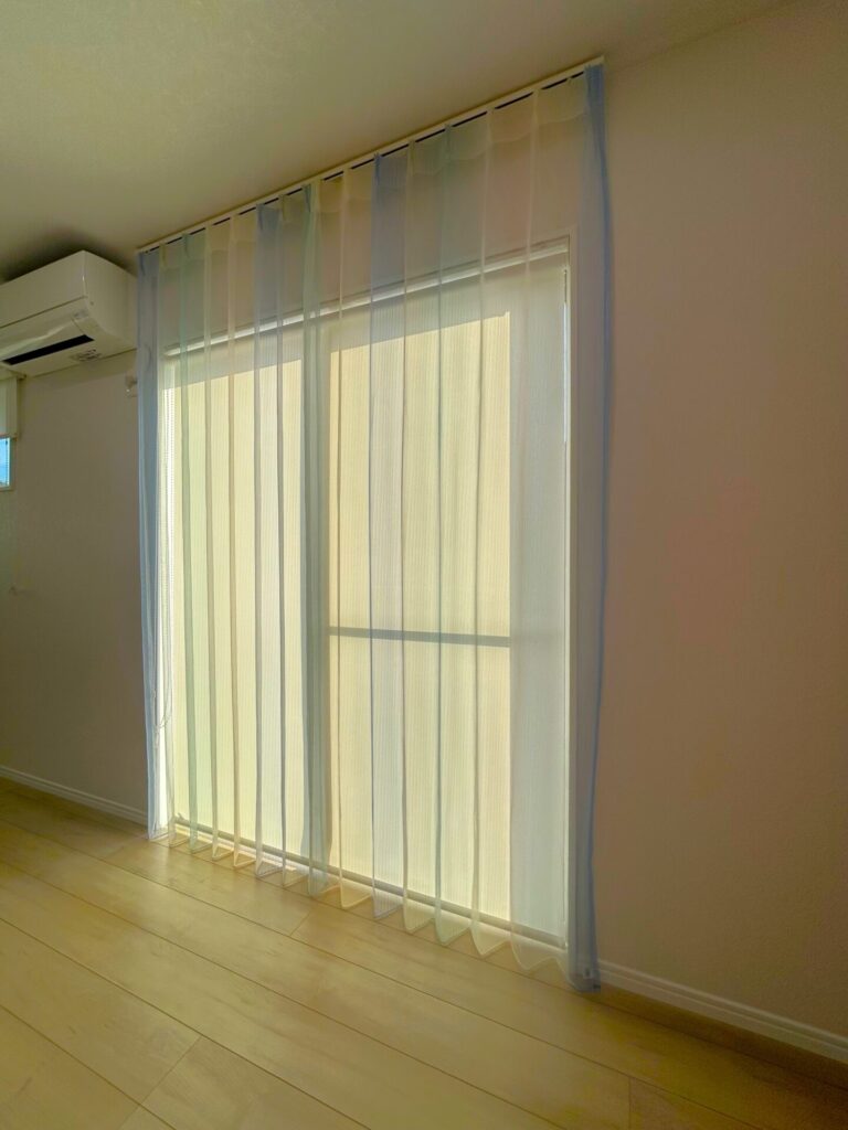 灰桜と白茶の組み合わせ畳を採用し、窓には色が綺麗なこだわりのプリーツスクリーンを設置しました。 -